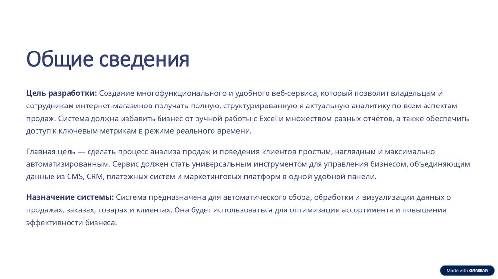 продаж. Система должна избавить бизнес от ручной работы с Excel и множеством разных отчётов, а также обеспечить