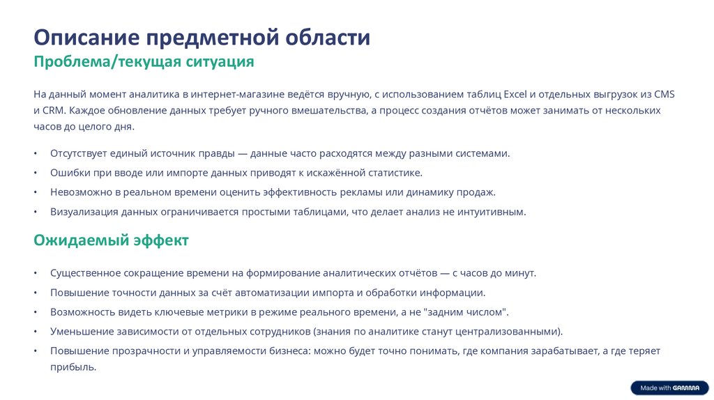 На данный момент аналитика в интернет-магазине ведётся вручную, с использованием таблиц Excel и отдельных выгрузок из CMS