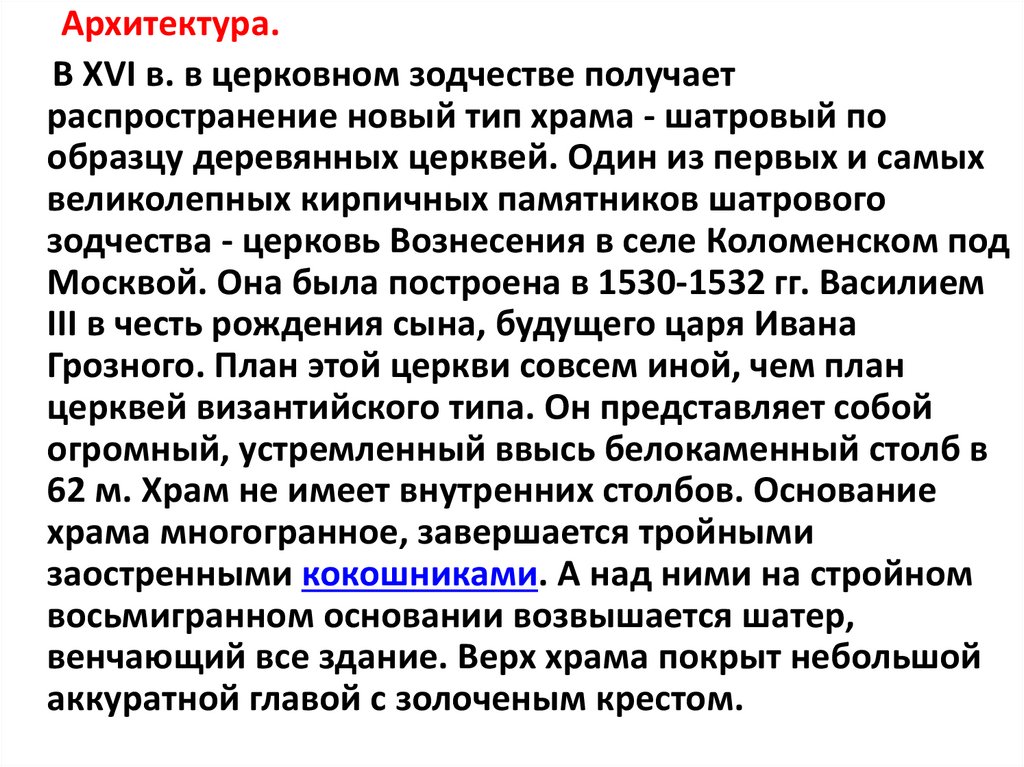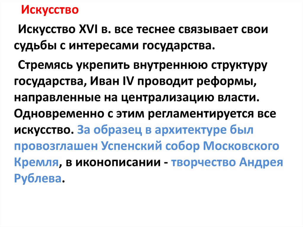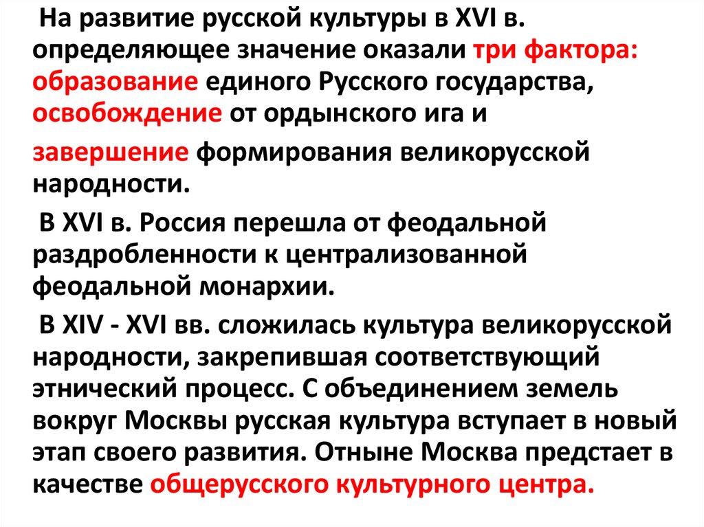 На развитие русской культуры в XVI в.определяющее значение оказали три фактора: