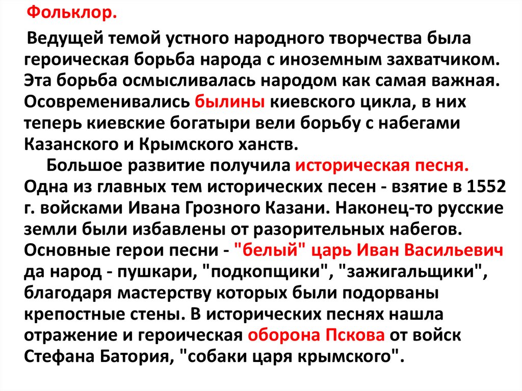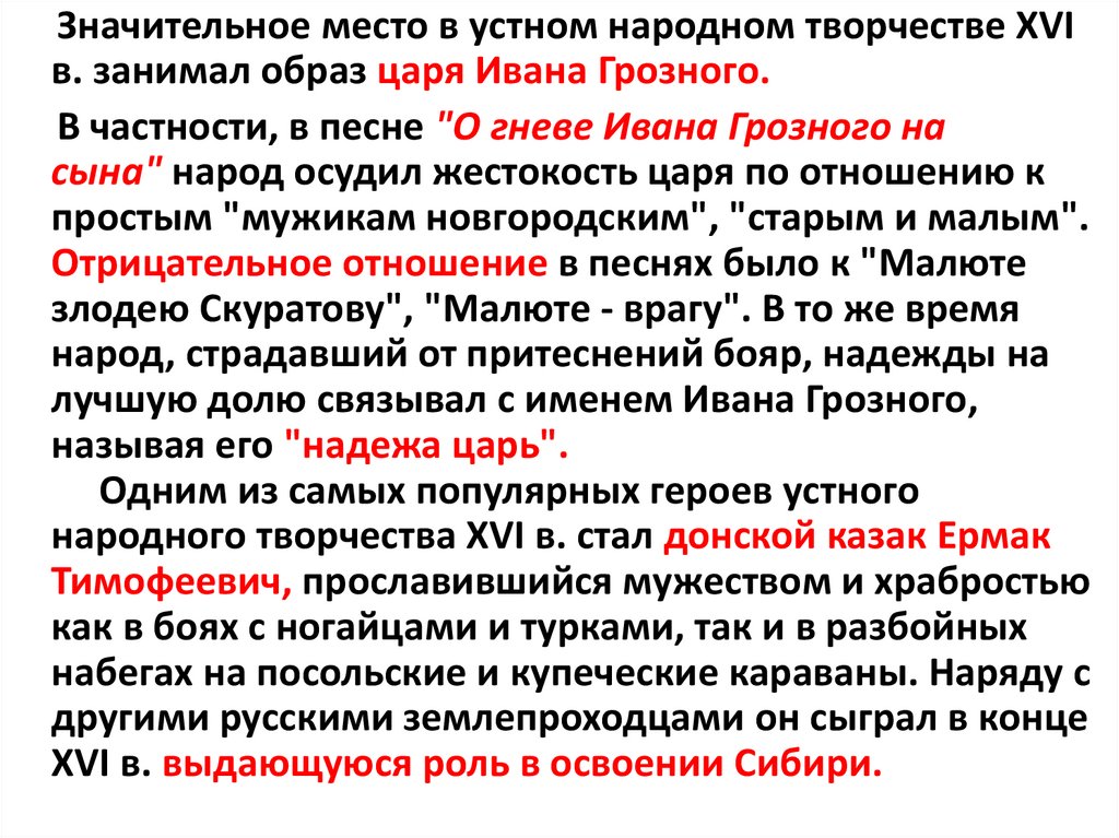 Значительное место в устном народном творчестве XVIв. занимал образ царя Ивана Грозного.