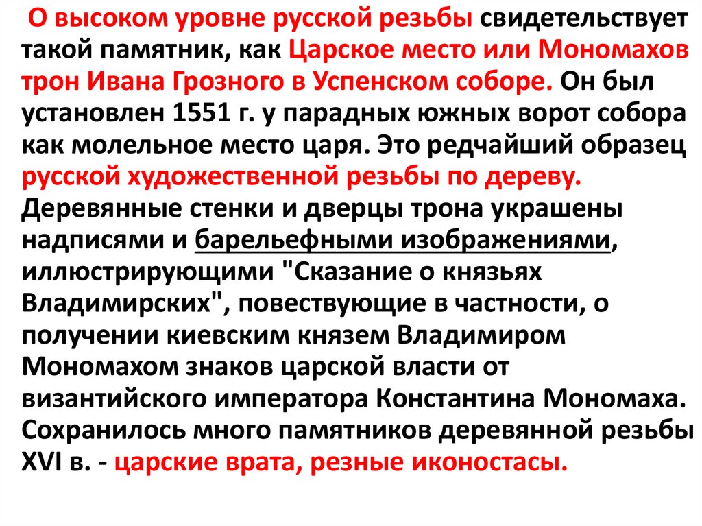 О высоком уровне русской резьбы свидетельствуеттакой памятник, как Царское место или Мономахов