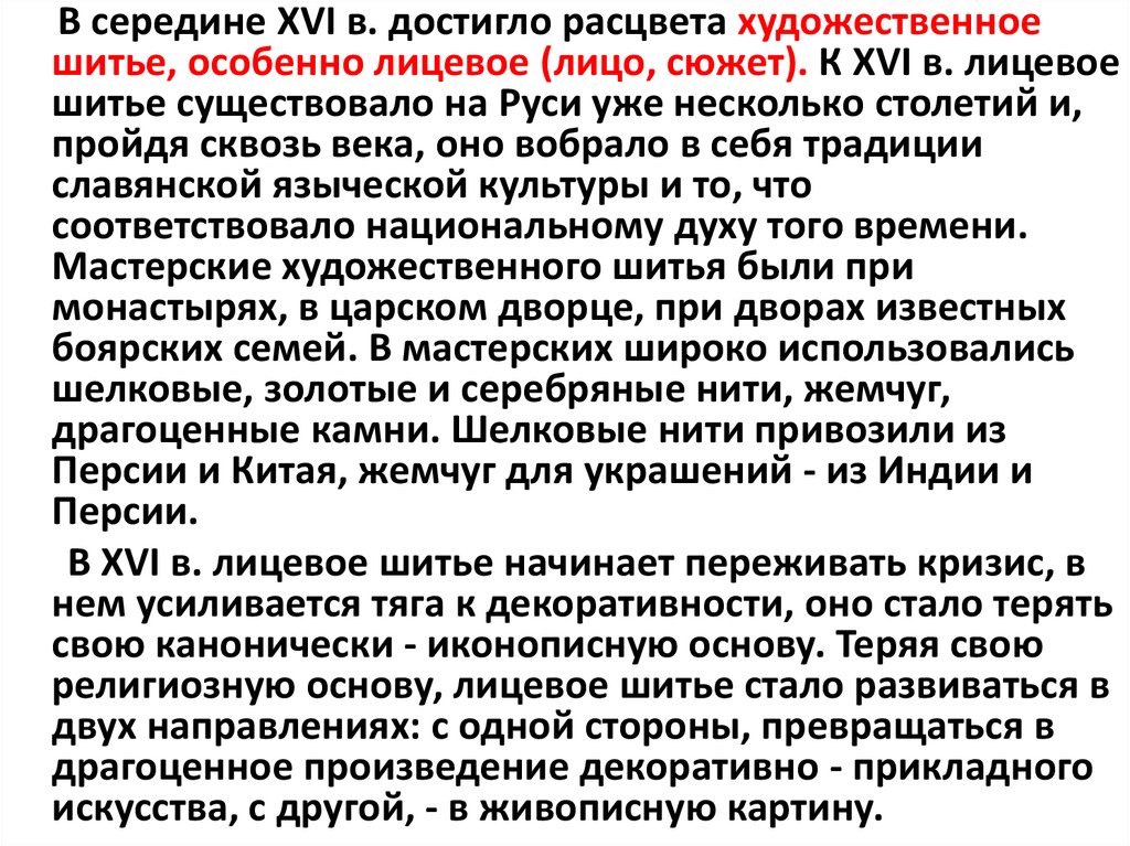 В середине XVI в. достигло расцвета художественноешитье, особенно лицевое (лицо, сюжет). К XVI в. лицевое