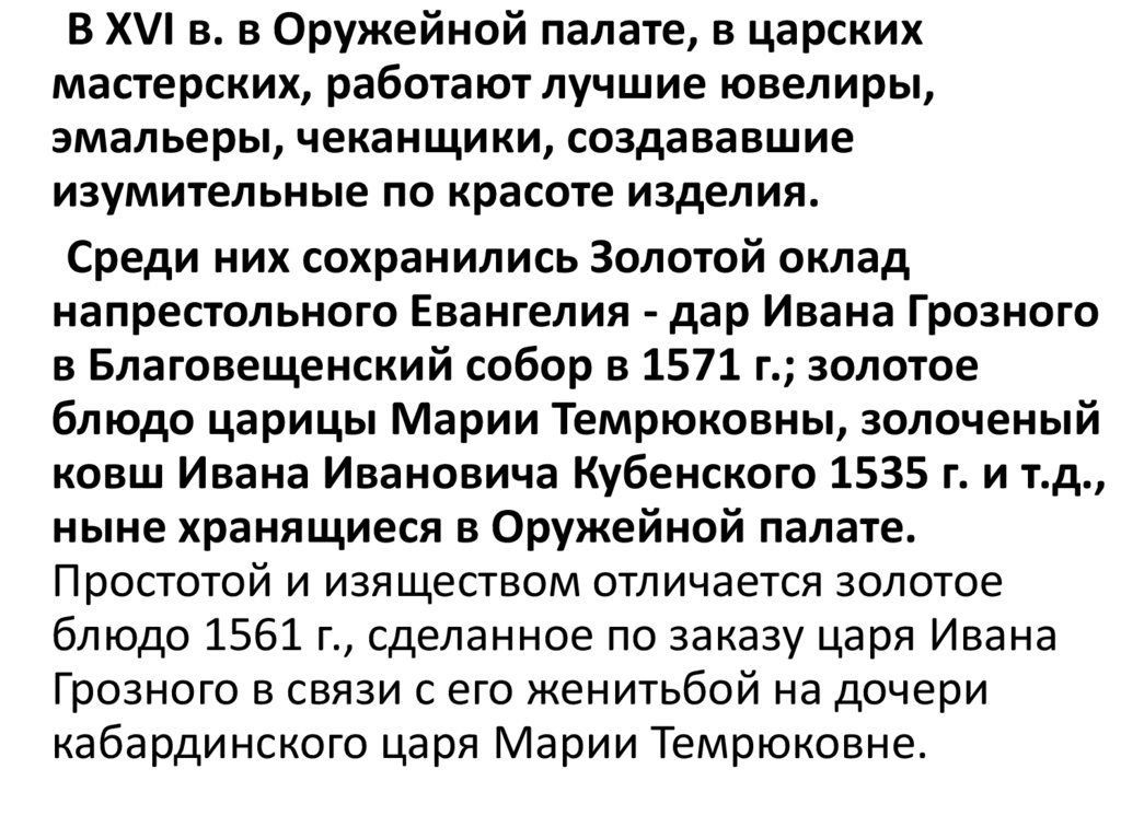 В XVI в. в Оружейной палате, в царскихмастерских, работают лучшие ювелиры,