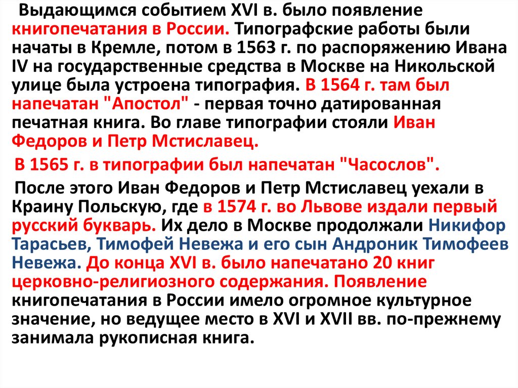 Выдающимся событием XVI в. было появлениекнигопечатания в России. Типографские работы были