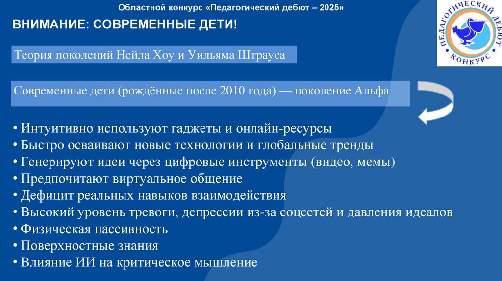 Областной конкурс «Педагогический дебют – 2025»ВНИМАНИЕ: СОВРЕМЕННЫЕ ДЕТИ!