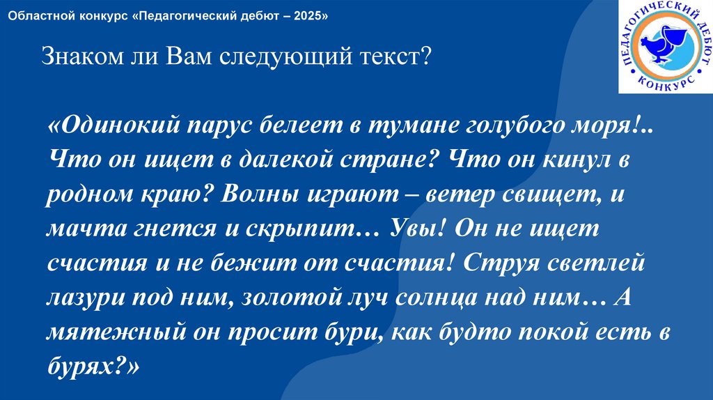 Областной конкурс «Педагогический дебют – 2025»Знаком ли Вам следующий текст?