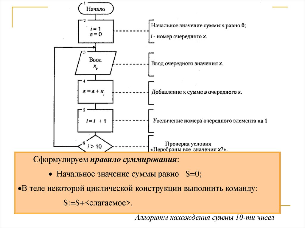 Сформулируем правило суммирования:Начальное значение суммы равно S=0;
