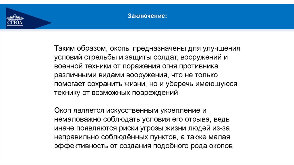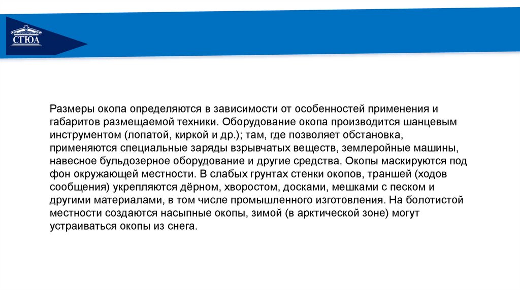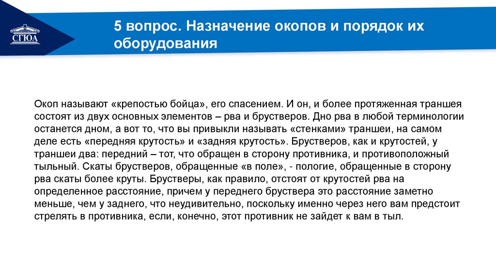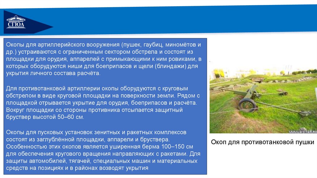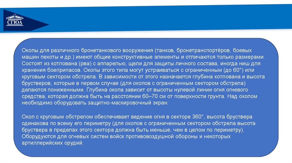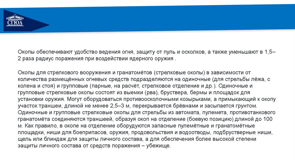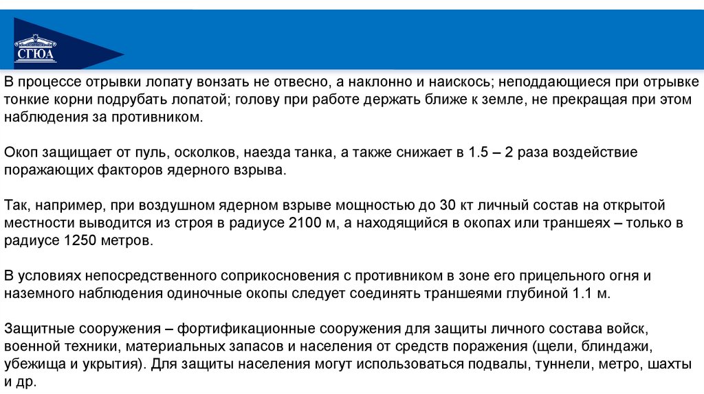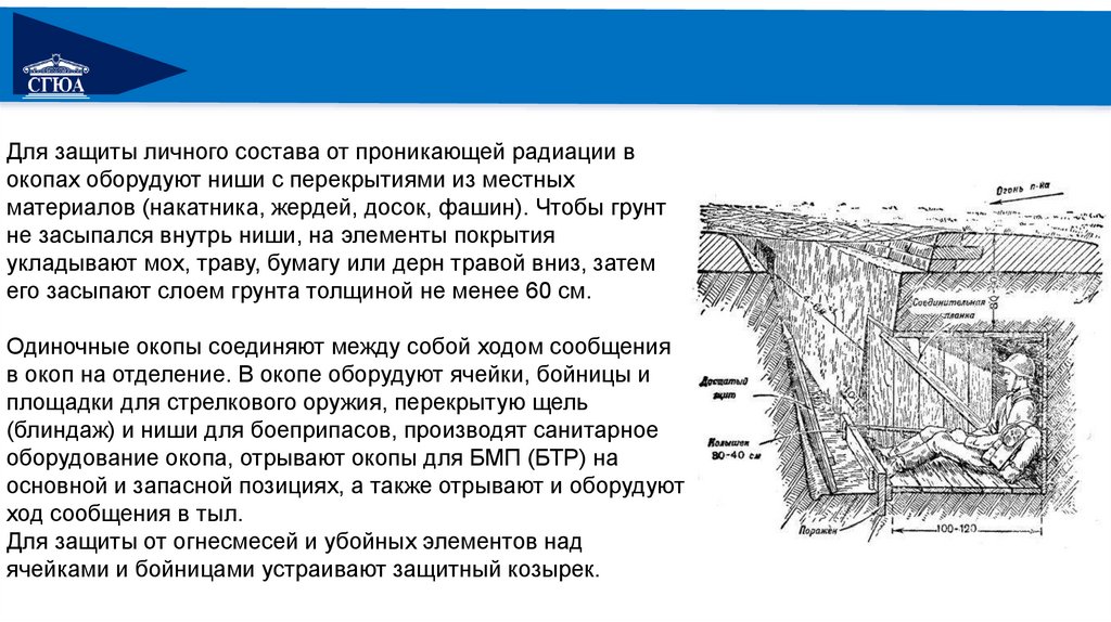 Окоп защищает от пуль, осколков, наезда танка, а также снижает в 1.5 – 2 раза воздействие