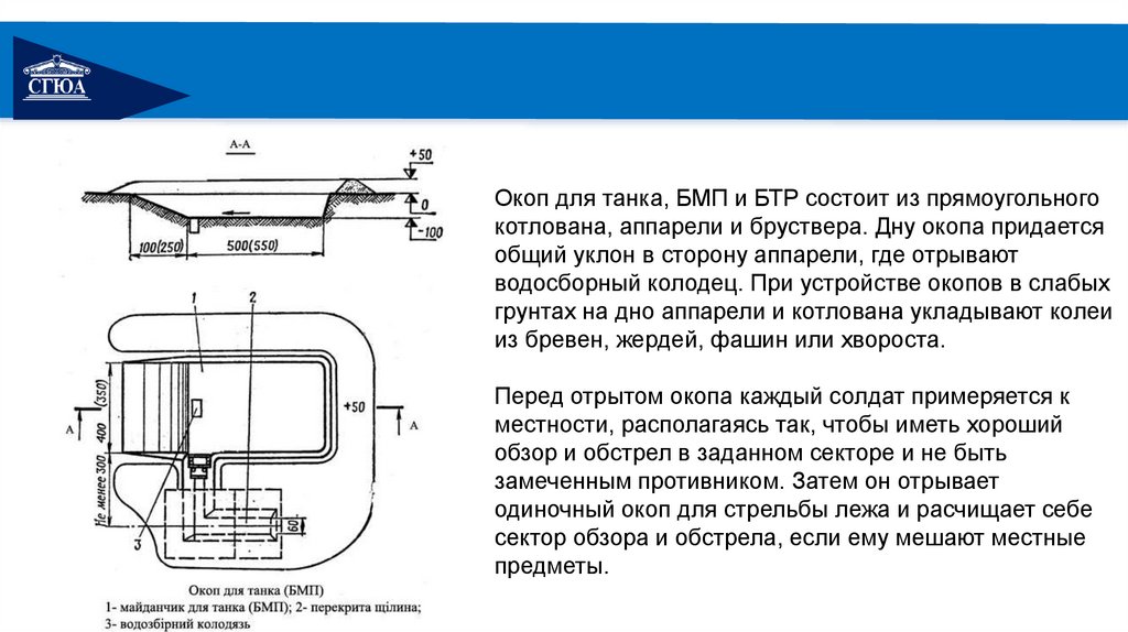 боеприпасов, отрывка и маскировка местными предметами запасного окопа для БТР. На устройство окопа
