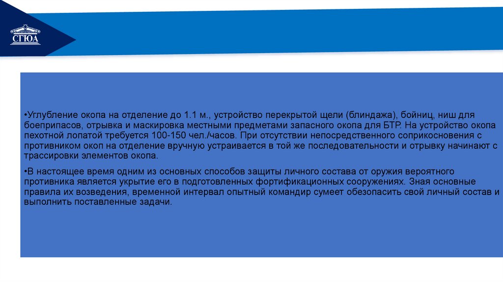 •Углубление окопа до 1.1 м., устройство парных окопов, начало отрывки окопа на БТР.