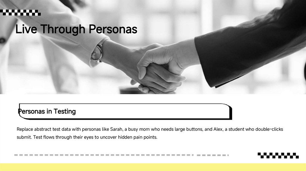Replace abstract test data with personas like Sarah, a busy mom who needs large buttons, and Alex, a student who double-clicks