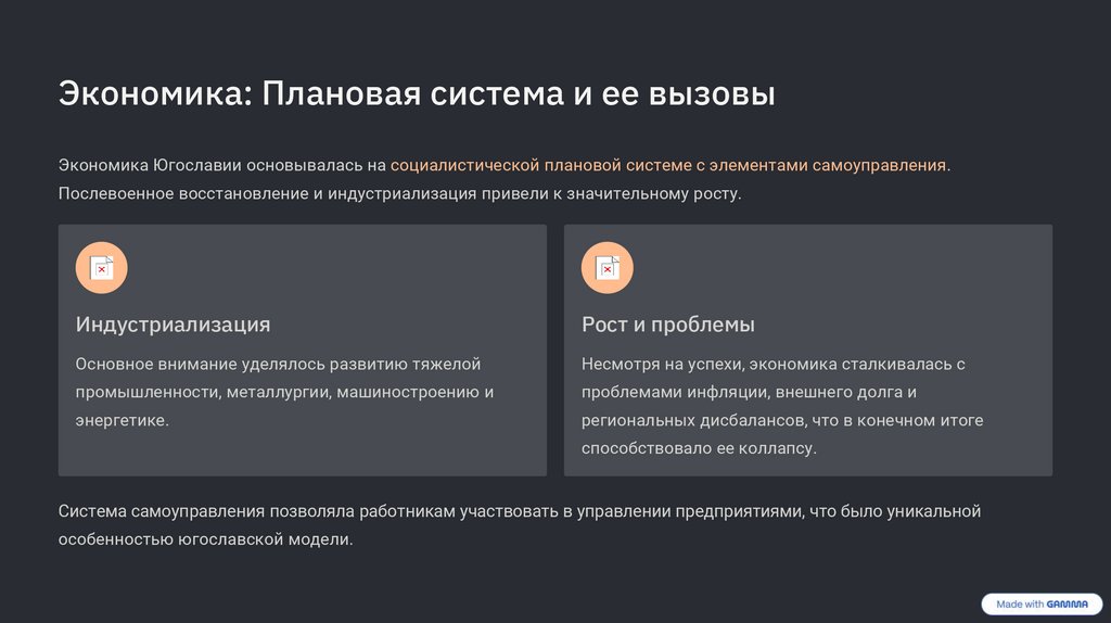 Экономика: Плановая система и ее вызовыЭкономика Югославии основывалась на социалистической плановой системе с элементами самоуправления.