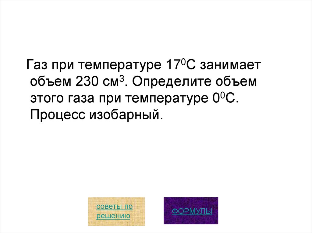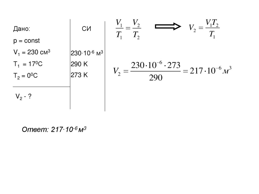 Газ при температуре 170С занимаетобъем 230 см3. Определите объем