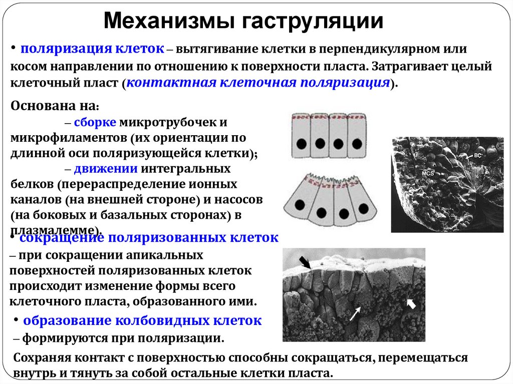 Механизмы гаструляции• поляризация клеток – вытягивание клетки в перпендикулярном или