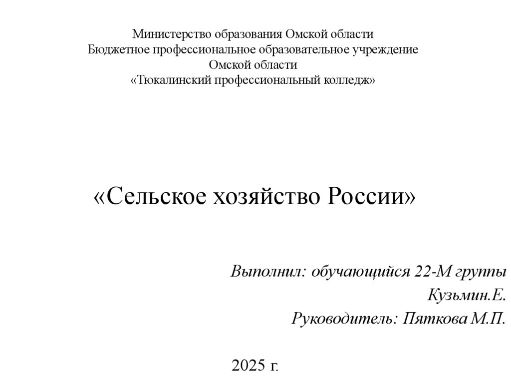 1. Министерство образования Омской области Бюджетное профессиональное образовательное учреждение Омской области «Тюкалинский