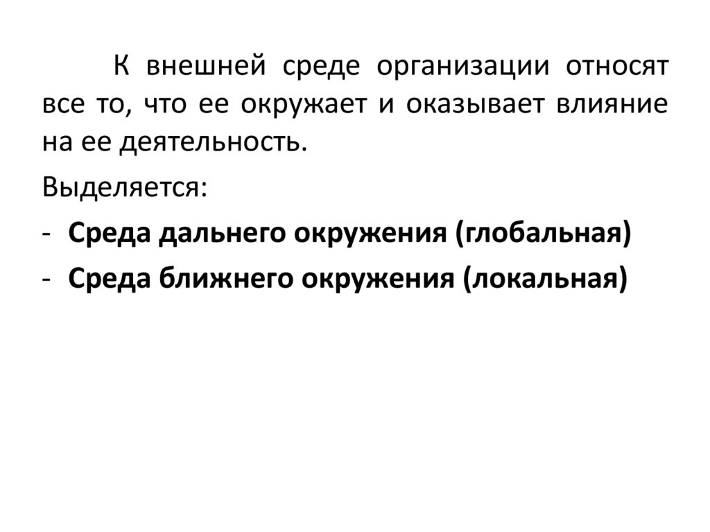 К внешней среде организации относятвсе то, что ее окружает и оказывает влияние