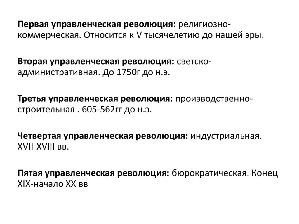Первая управленческая революция: религиознокоммерческая. Относится к V тысячелетию до нашей эры.Вторая управленческая революция: светскоадминистративная. До 1750г до н.э.