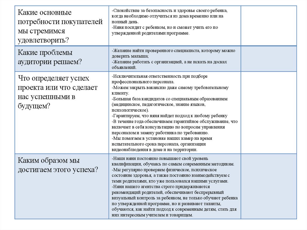 Для наглядности в таблице разобраны все 5 ключевых вопросов с ответами на примере