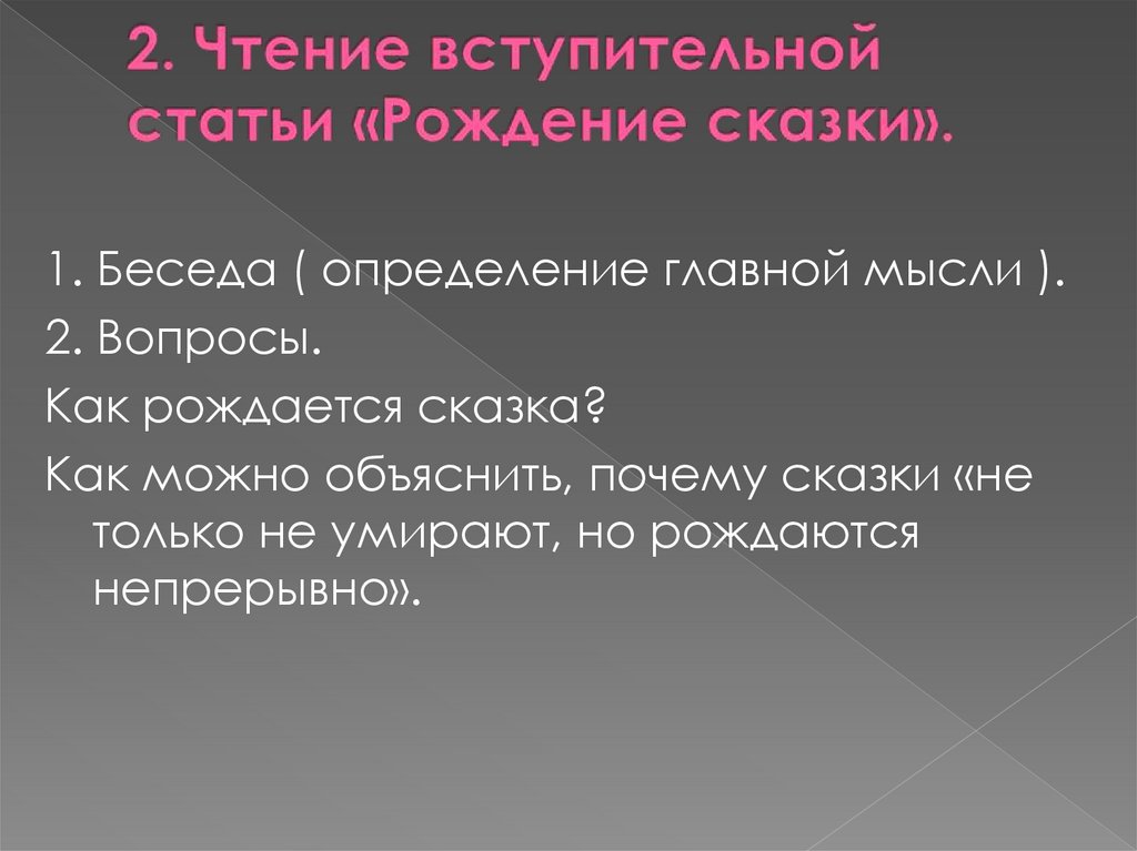 1. Беседа ( определение главной мысли ).2. Вопросы.