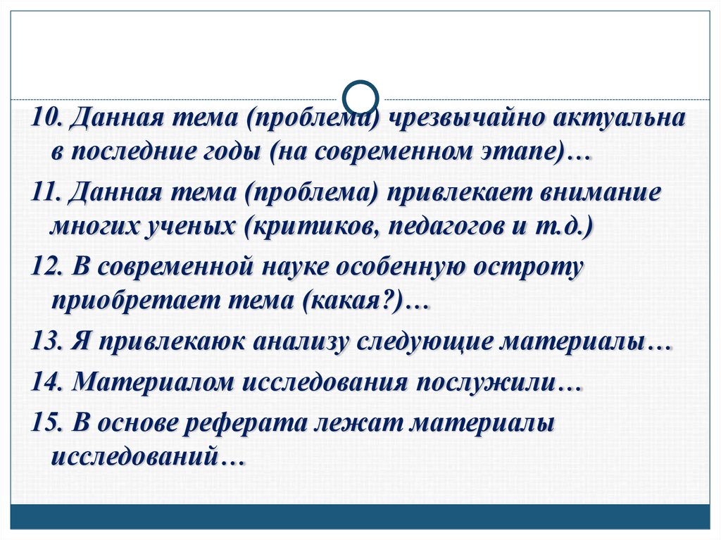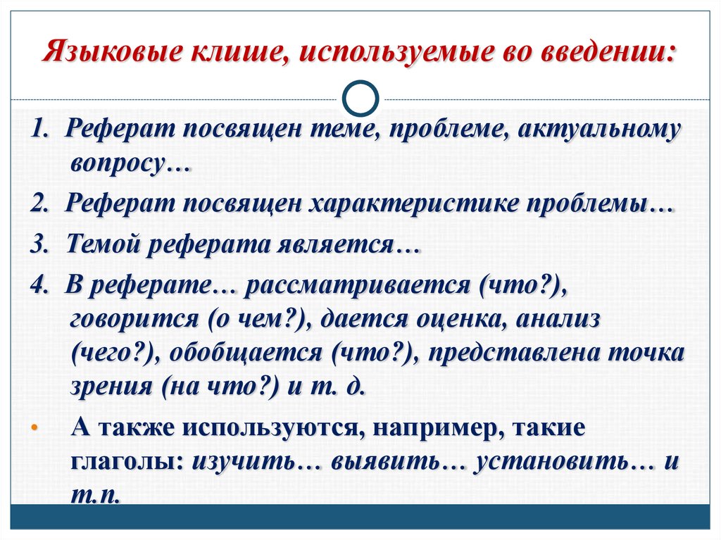 Языковые клише, используемые во введении:1. Реферат посвящен теме, проблеме, актуальному