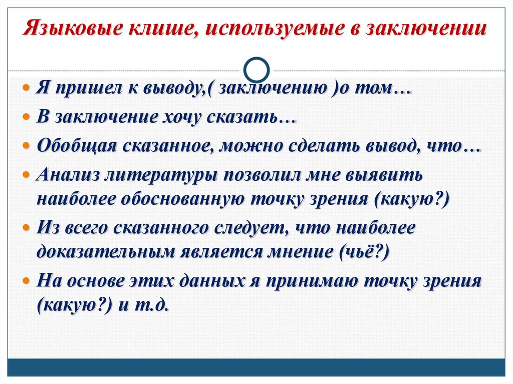 Языковые клише, используемые в заключенииЯ пришел к выводу,( заключению )о том…