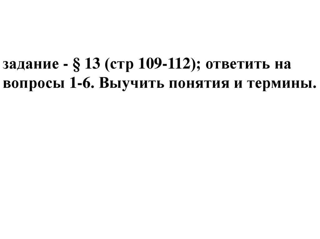 задание - § 13 (стр 109-112); ответить навопросы 1-6. Выучить понятия и термины.