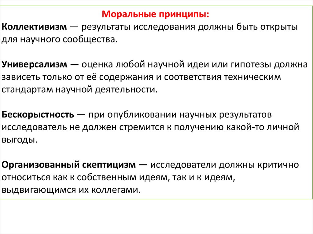 Моральные принципы:Коллективизм — результаты исследования должны быть открыты