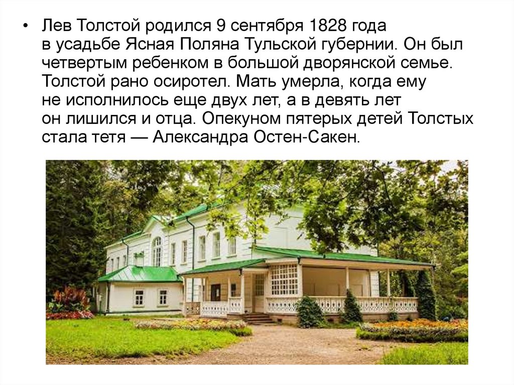 • Лев Толстой родился 9 сентября 1828 годав усадьбе Ясная Поляна Тульской губернии. Он был