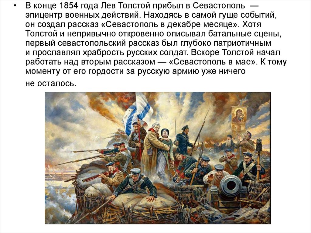 • В конце 1854 года Лев Толстой прибыл в Севастополь —эпицентр военных действий. Находясь в самой гуще событий,
