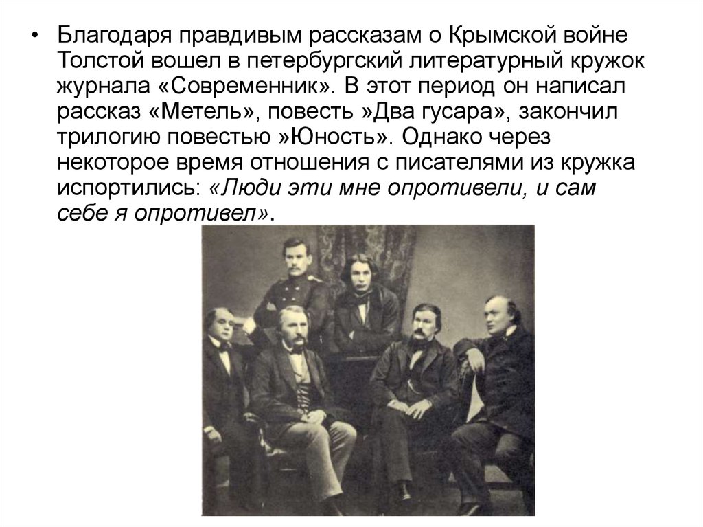• Благодаря правдивым рассказам о Крымской войнеТолстой вошел в петербургский литературный кружок