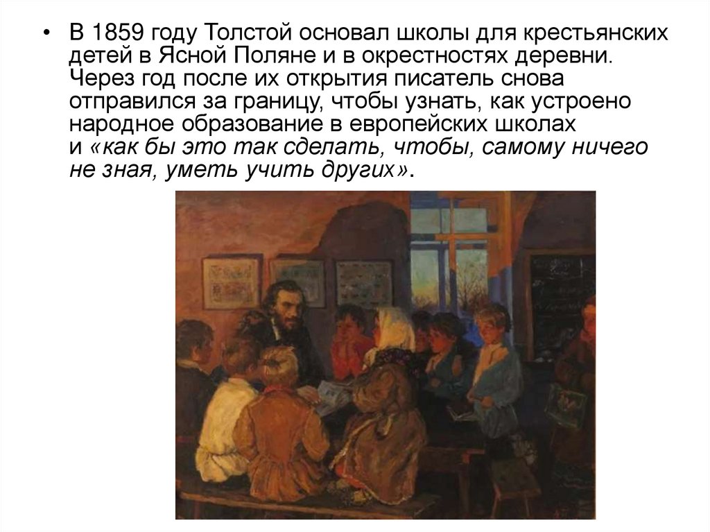 • В 1859 году Толстой основал школы для крестьянскихдетей в Ясной Поляне и в окрестностях деревни.
