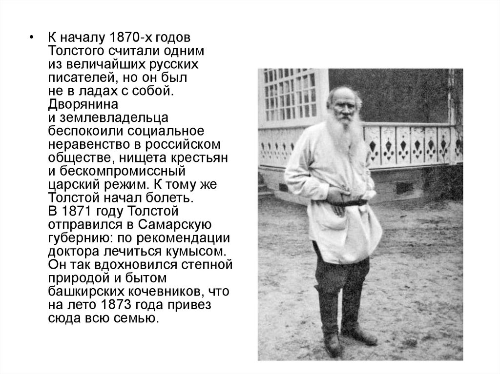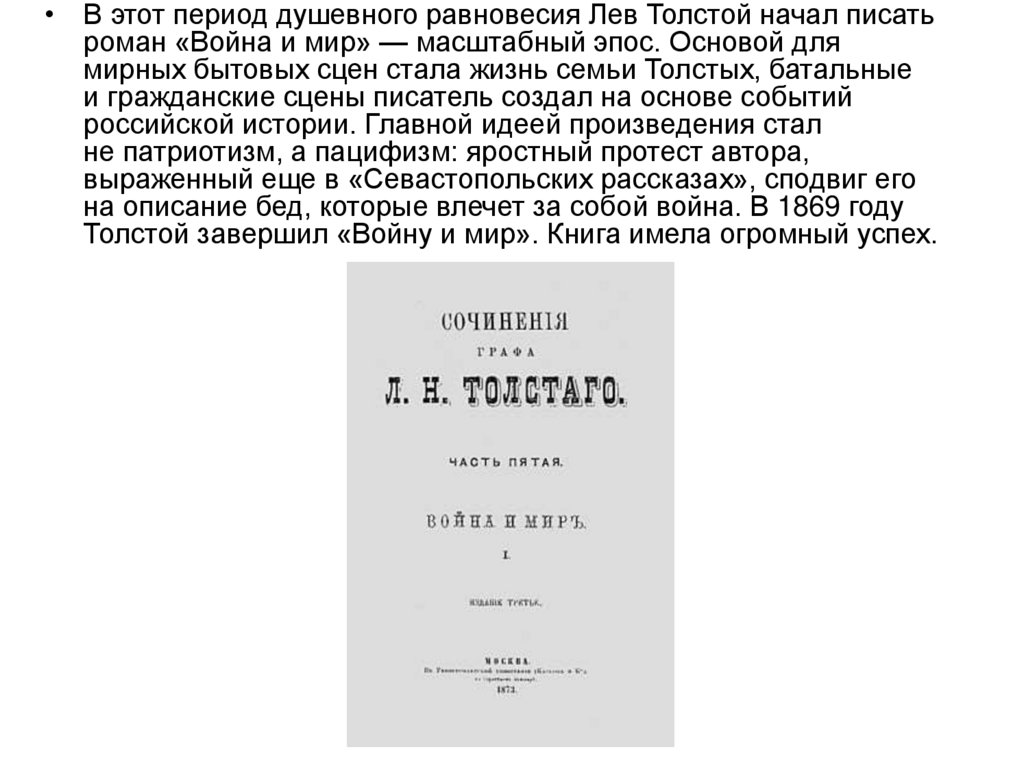 • В этот период душевного равновесия Лев Толстой начал писатьроман «Война и мир» — масштабный эпос. Основой для