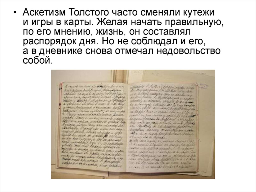 • Аскетизм Толстого часто сменяли кутежии игры в карты. Желая начать правильную,