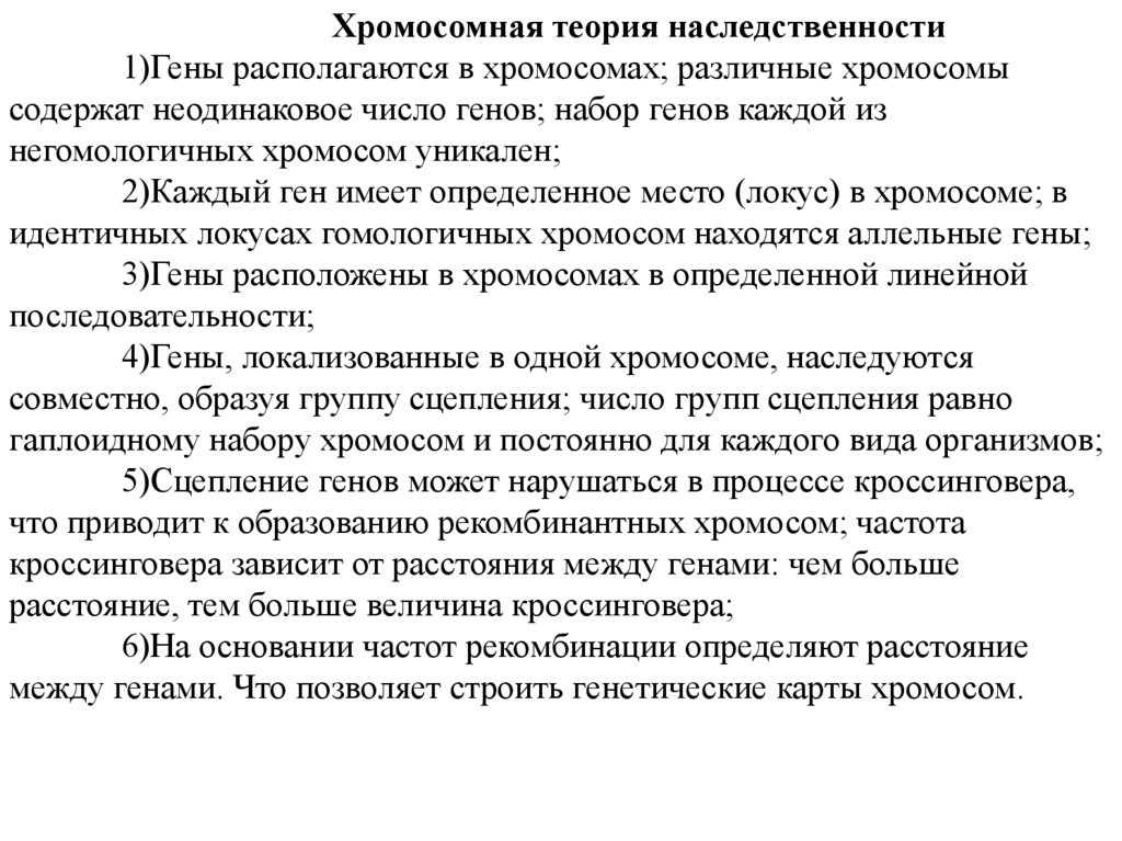 Хромосомная теория наследственности1)Гены располагаются в хромосомах; различные хромосомы
