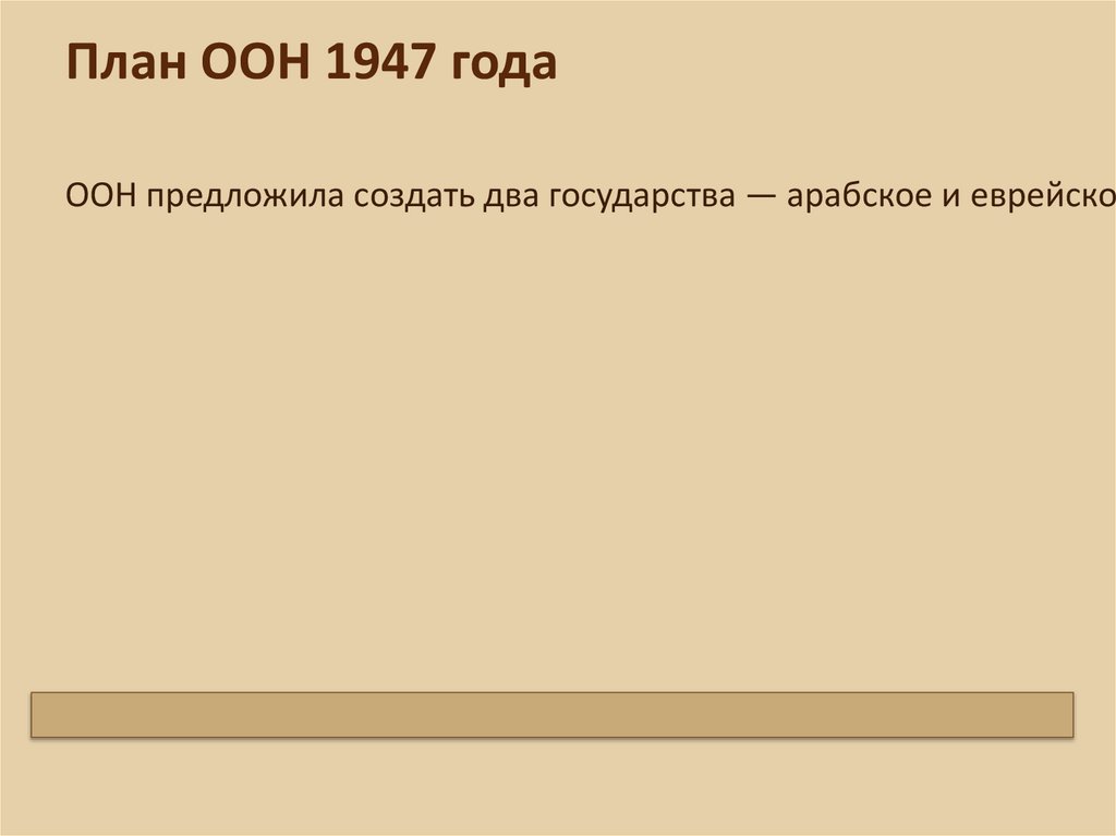 План ООН 1947 годаООН предложила создать два государства — арабское и еврейское