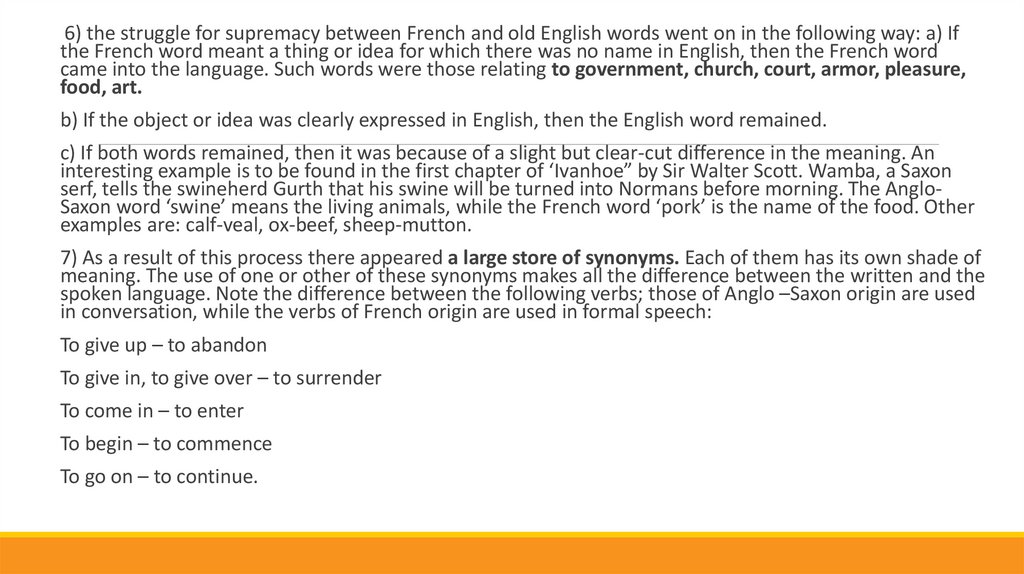 6) the struggle for supremacy between French and old English words went on in the following way: a) Ifthe French word meant a thing or idea for which there was no name in English, then the French word
