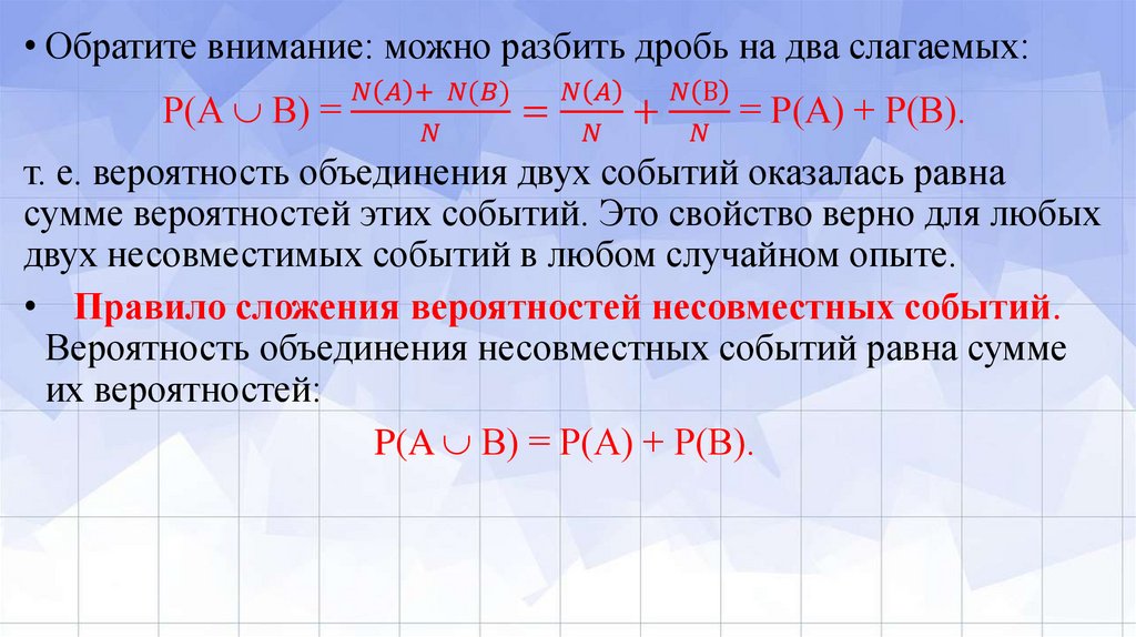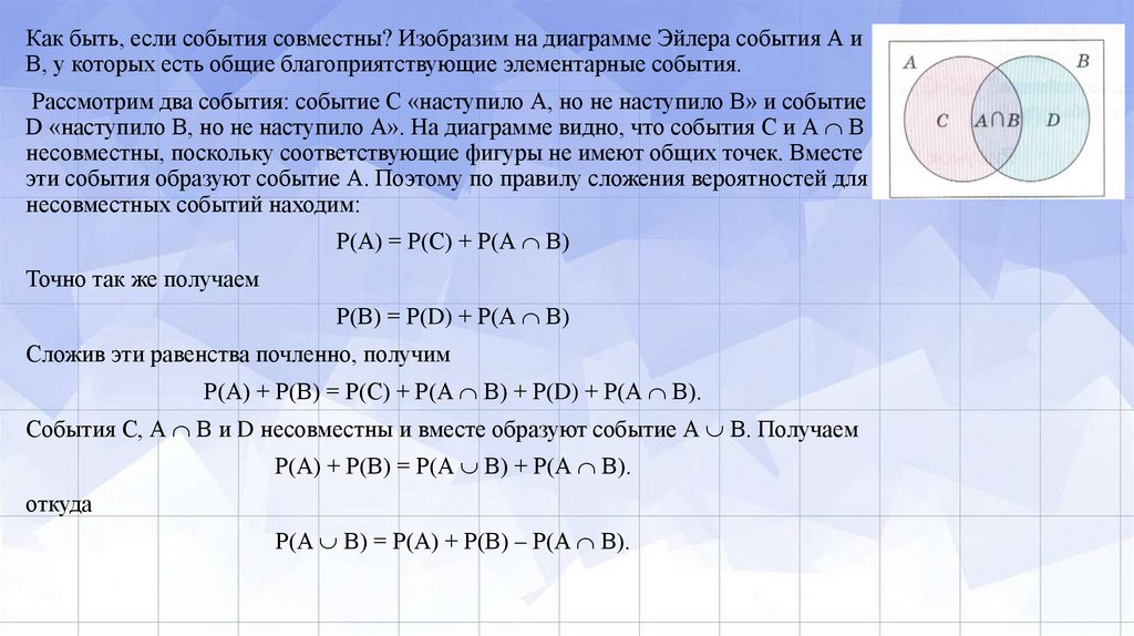 • Общих элементарных событий у событий А и В нет, ведь не