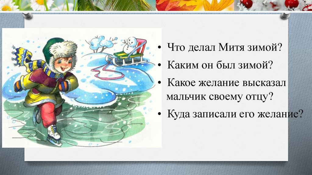 • Что делал Митя зимой?• Каким он был зимой?
