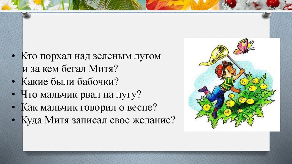 • Кто порхал над зеленым лугоми за кем бегал Митя?