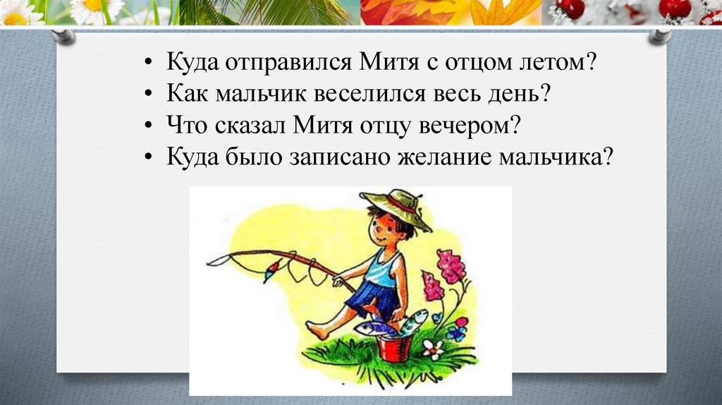 • Куда отправился Митя с отцом летом?• Как мальчик веселился весь день?