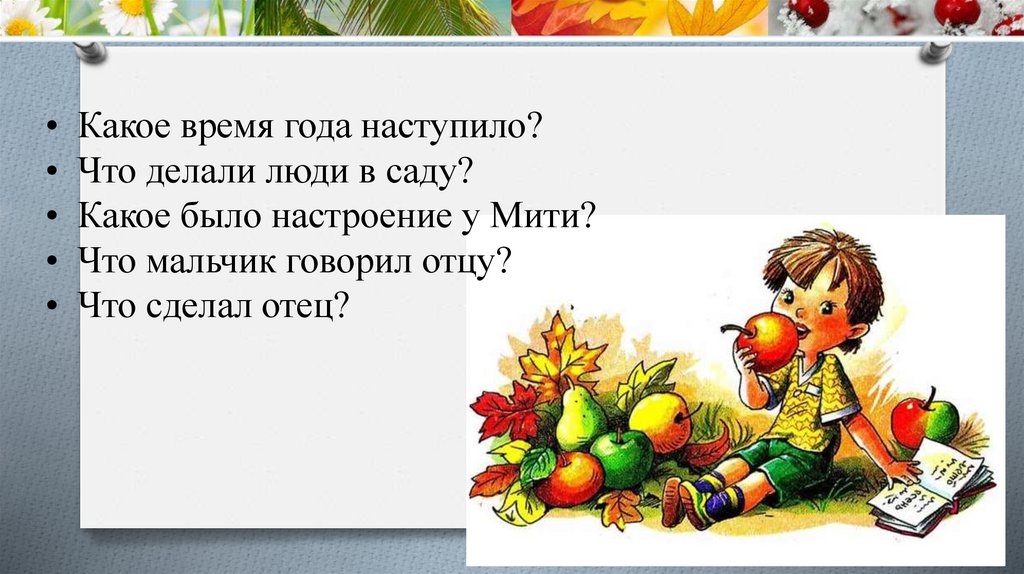 20. Наступила осень. В саду собирали плоды — румяные яблоки и жёлтые груши. Митя был в восторге и говорил отцу: — Осень лучше всех