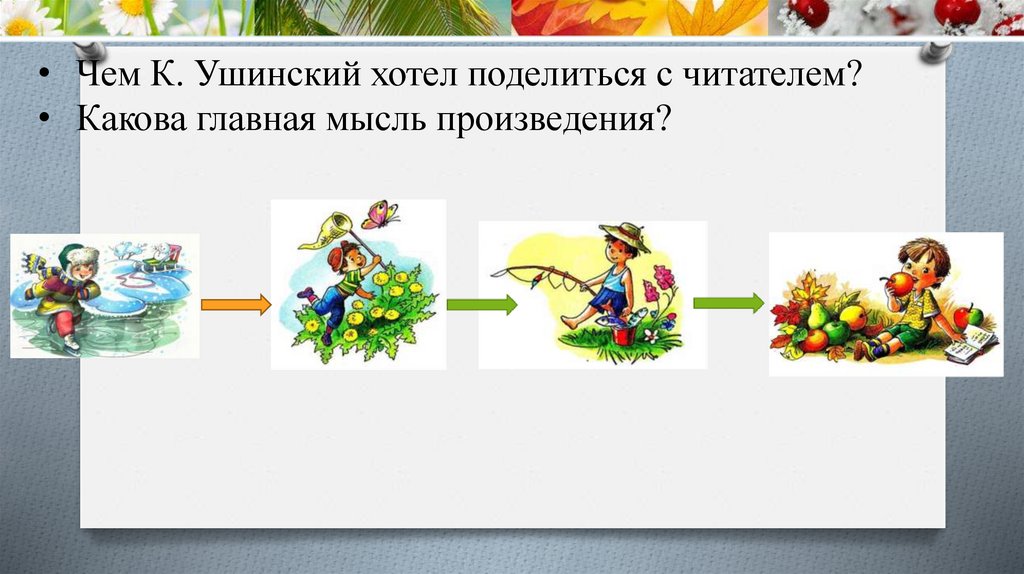 • Чем К. Ушинский хотел поделиться с читателем?• Какова главная мысль произведения?