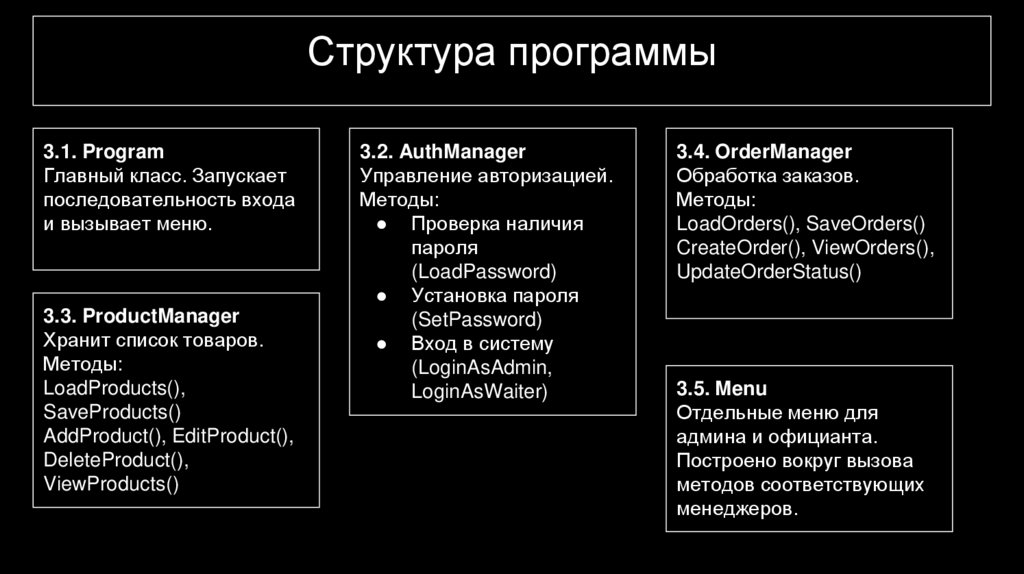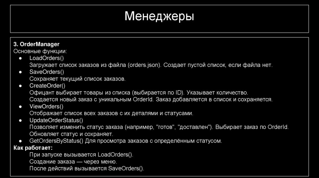● GetOrdersByStatus() Для просмотра заказов с определённым статусом.