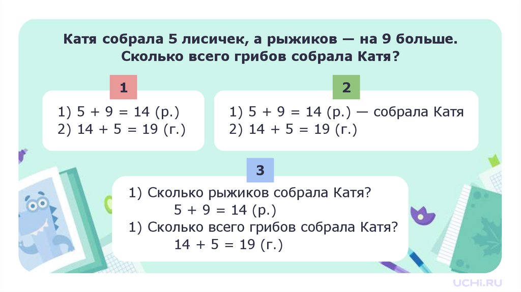 Катя собрала 5 лисичек, а рыжиков — на 9 больше.Сколько всего грибов собрала Катя?