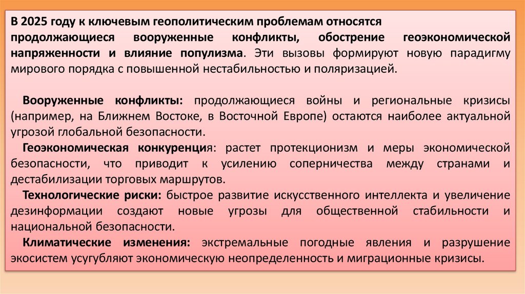 В 2025 году к ключевым геополитическим проблемам относятсяпродолжающиеся вооруженные конфликты, обострение геоэкономической