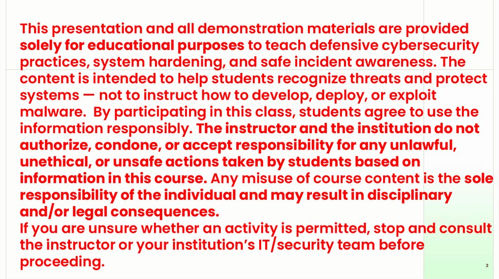 This presentation and all demonstration materials are providedsolely for educational purposes to teach defensive cybersecurity