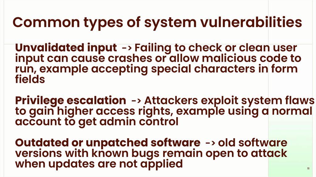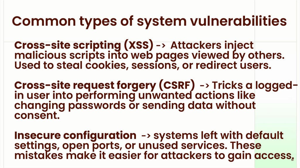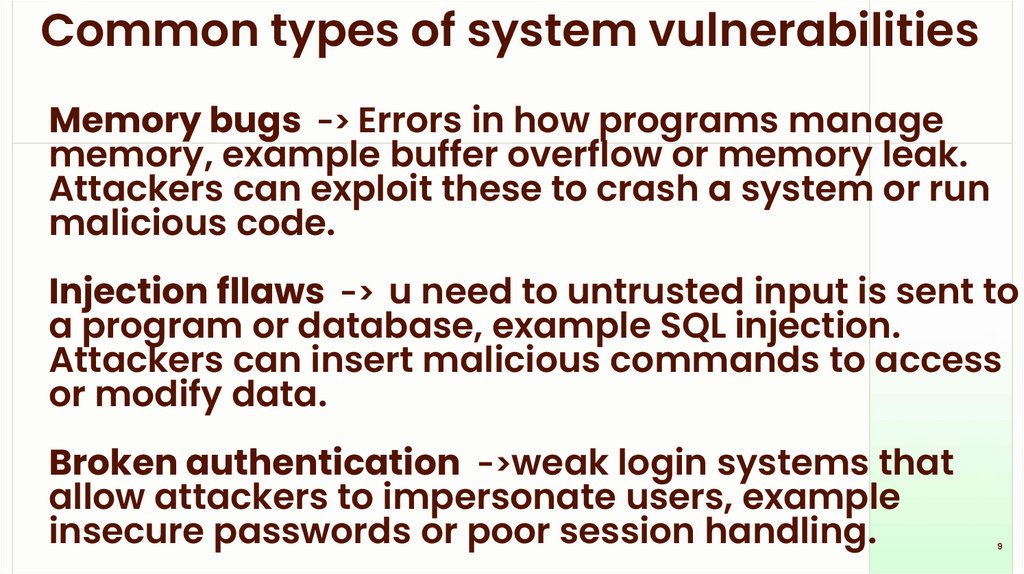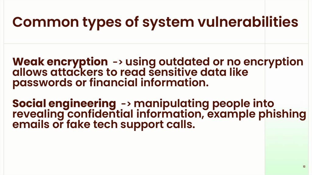 Common types of system vulnerabilitiesWeak encryption -> using outdated or no encryption