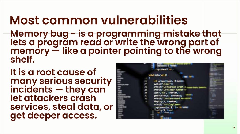 Common types of system vulnerabilitiesMemory bugs -> Errors in how programs manage