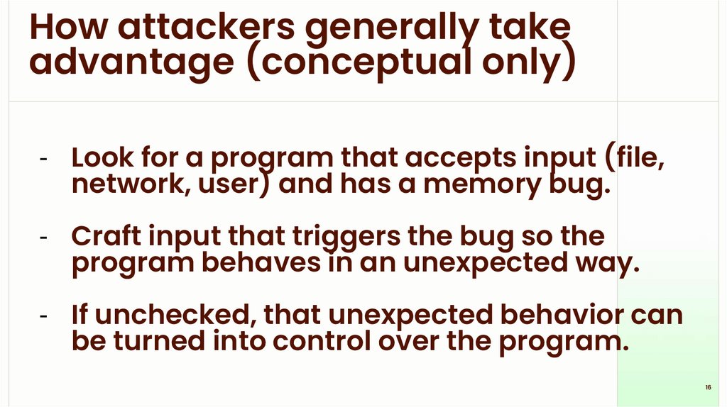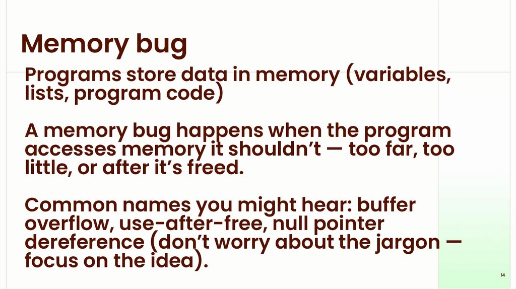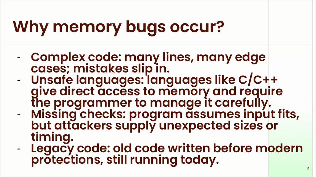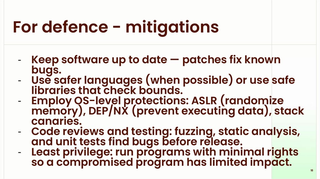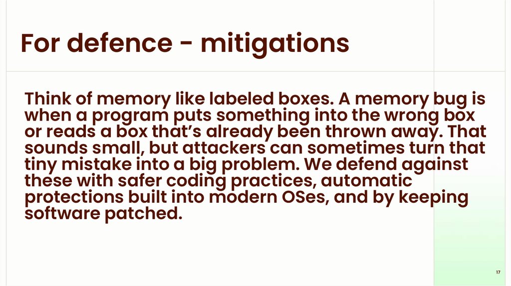 For defence - mitigationsThink of memory like labeled boxes. A memory bug is