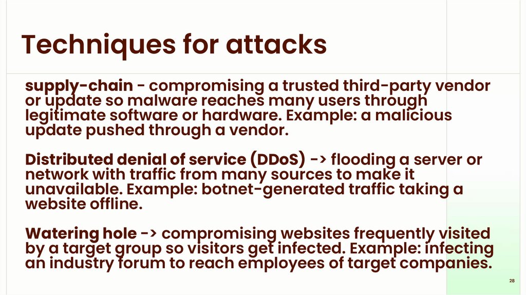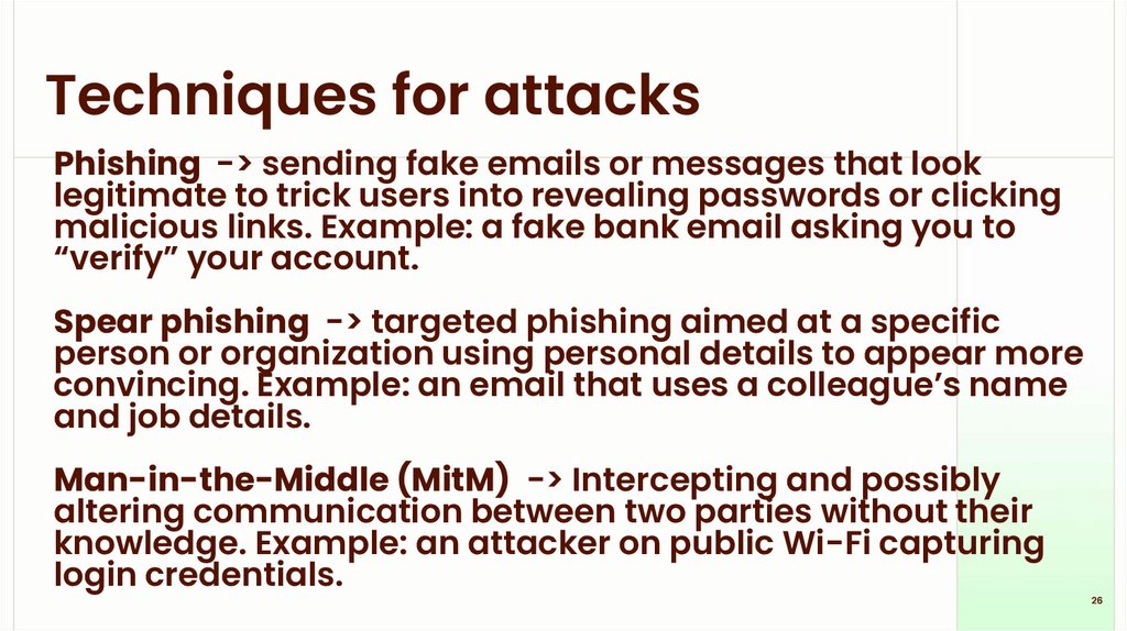 Techniques for attacksPhishing -> sending fake emails or messages that look